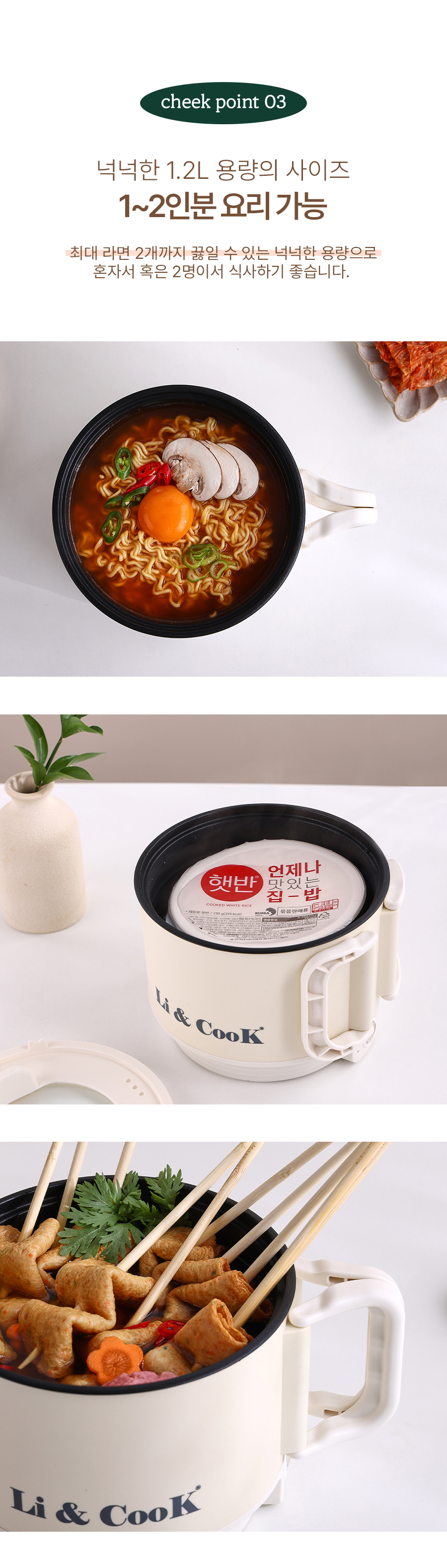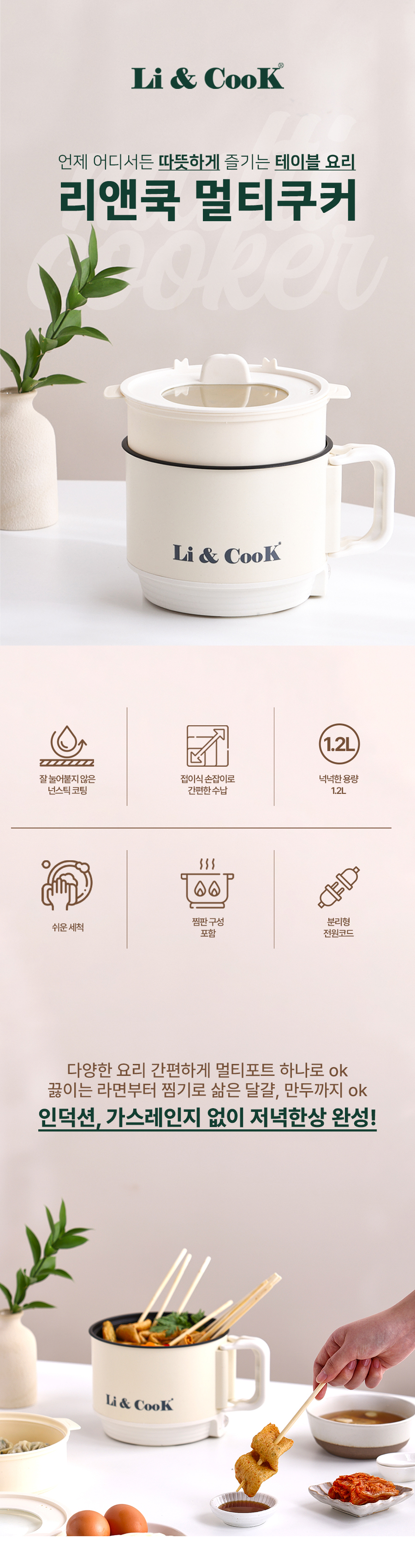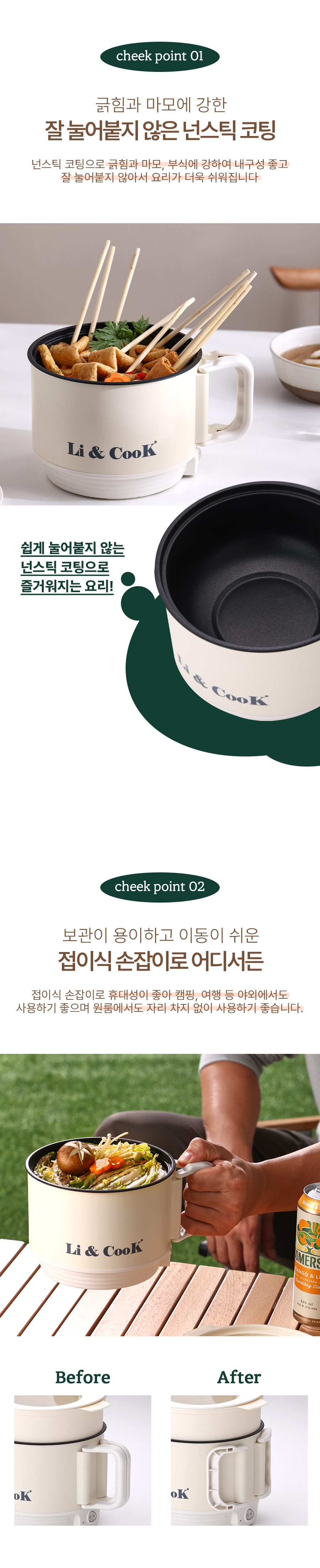 휴대가 간편해 여행과 캠핑에 최적화된 제품! 다양한 요리를 손쉽게 즐길 수 있도록 다기능을 갖춘 이 제품은 공간 절약에도 뛰어납니다. 여행 중에도 맛있는 요리를 간편하게 준비할 수 있는 필수 아이템! 리앤쿡 멀티쿠커를 소개드립니다.