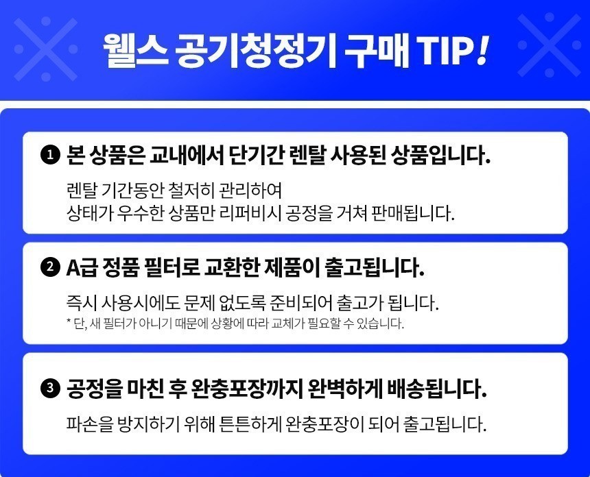 에너지 효율 1등급★ 교육기관에서 렌탈 종료 후 철저한 리퍼비시 과정을 거친 웰스 공기청정기! 구동 테스트, 세척, 완충 포장 등 꼼꼼한 절차를 통해 새 제품처럼 완벽히 준비되었습니다. 보관 상태가 양호하여 자신 있게 추천드립니다. 이 기회를 놓치지 마세요!