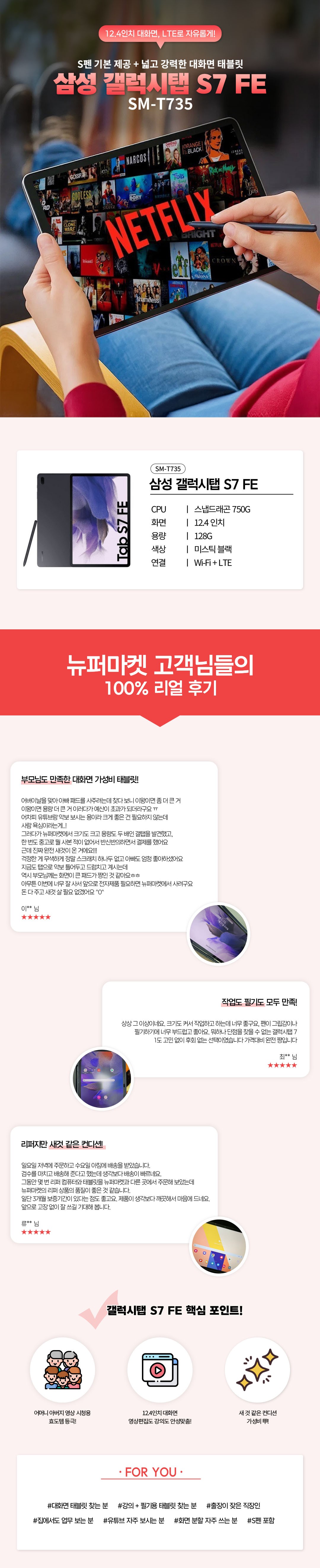 이 제품은 12.4인치의 압도적인 대화면을 탑재하여 학습과 업무의 효율을 극대화하며, 미스틱 블랙의 세련된 디자인으로 프리미엄의 가치를 더했습니다. LTE 지원으로 장소 제약 없이 언제 어디서나 실시간 연결이 가능하며, 기본 포함된 S펜을 통해 실제 종이에 쓰는 듯한 정교한 필기 경험을 제공합니다. 특히 전문 검수를 마친 A급 리퍼 제품으로, 신제품급 컨디션을 유지하면서도 가격 부담은 획기적으로 낮춘 가장 경제적인 대화면 태블릿 솔루션입니다.