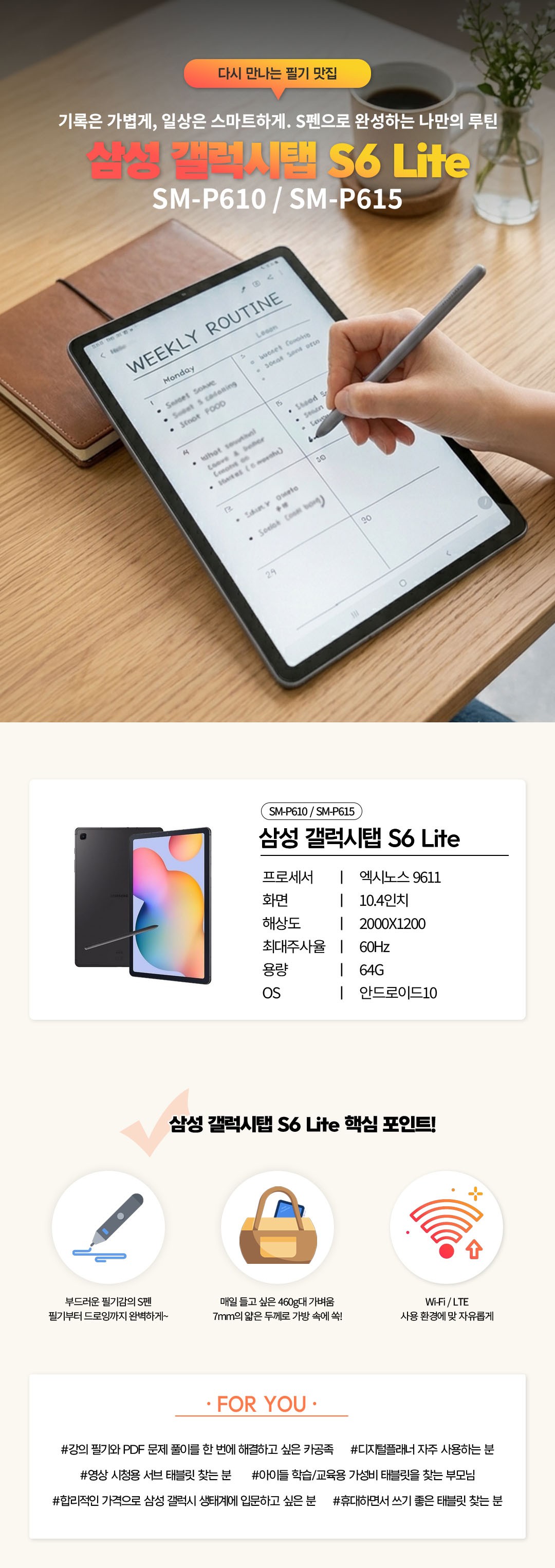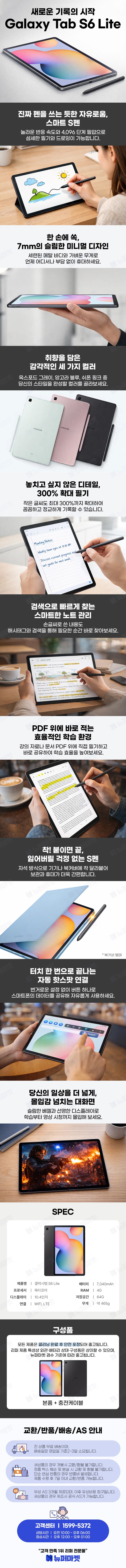 휴대성 좋은 가벼운 무게와 사이즈, 영상 시청에 최적화된 WUXGA+(2000x1200)의 놀라운 해상도까지 모든게 완벽한 갤럭시 탭 S6 Lite를 뉴퍼마켓에서 합리적인 가격에 런칭하였습니다.