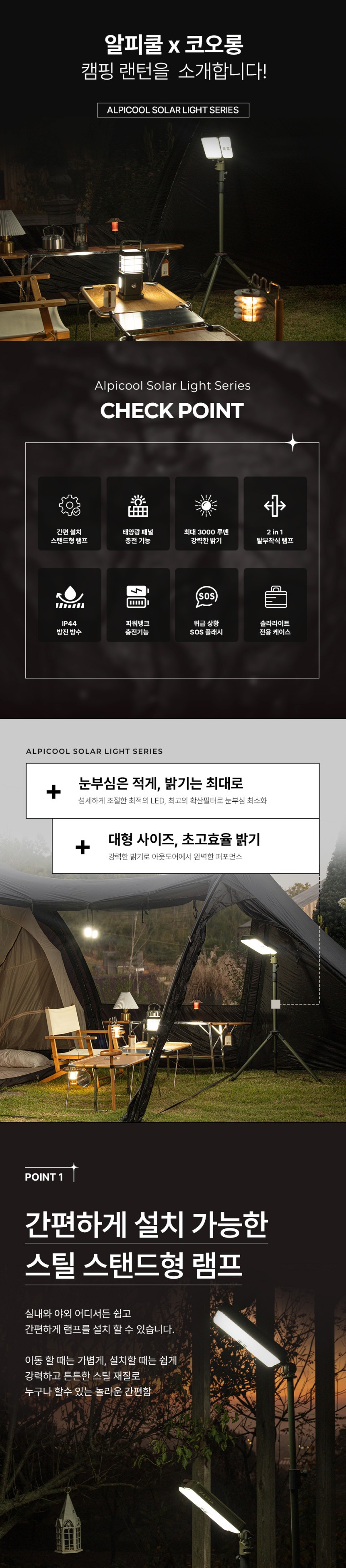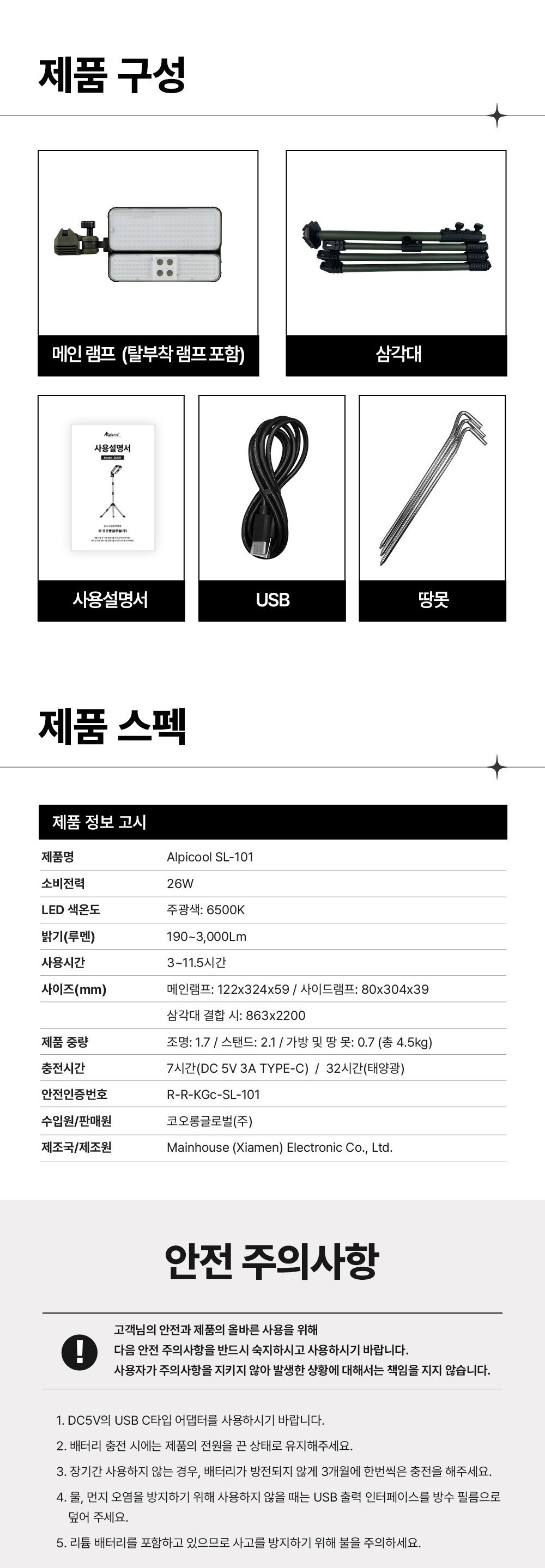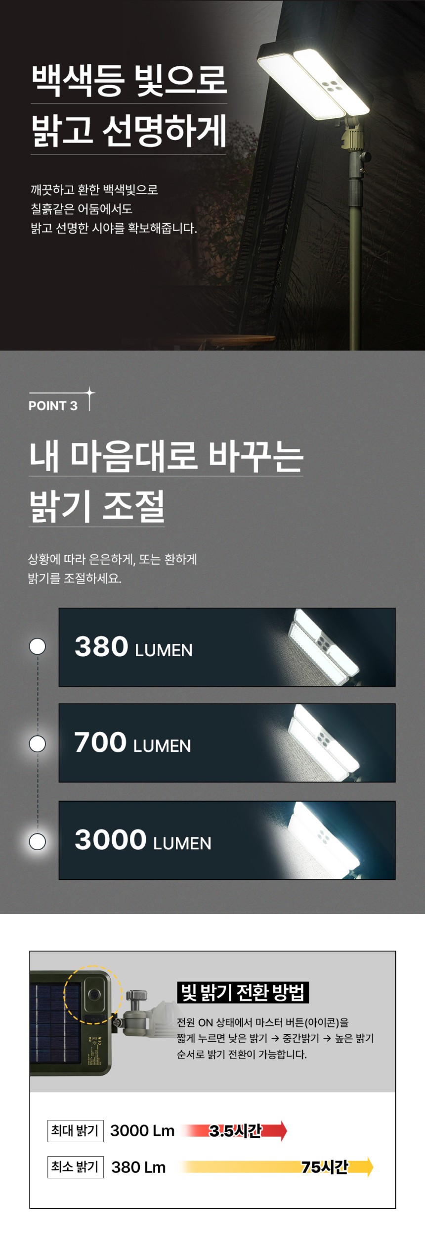 랜턴(램프) / 실내등 / 최대밝기 : 3000루멘 / 밝기조절 : 5단계 / 최대사용시간 : 11.5시간 / 전원공급방식 : USB충전식 , 태양열 / 부가기능 : 점멸등 , 생활방수 , 자석내장 , 보조배터리 / 무게 : 930g / 크기(가로x세로x높이): 메인램프-12.2x32.4x5.9cm, 사이드램프-8x30.4x3.9cm