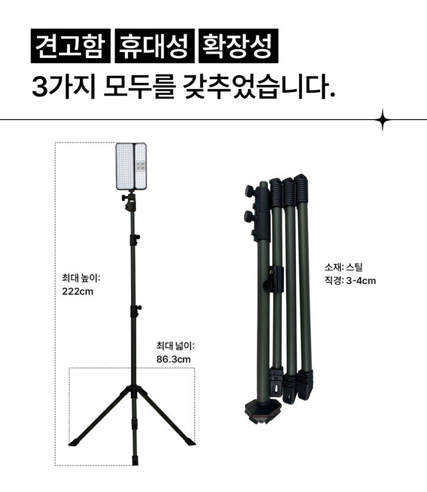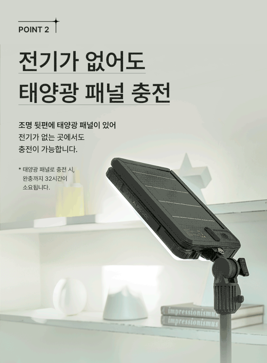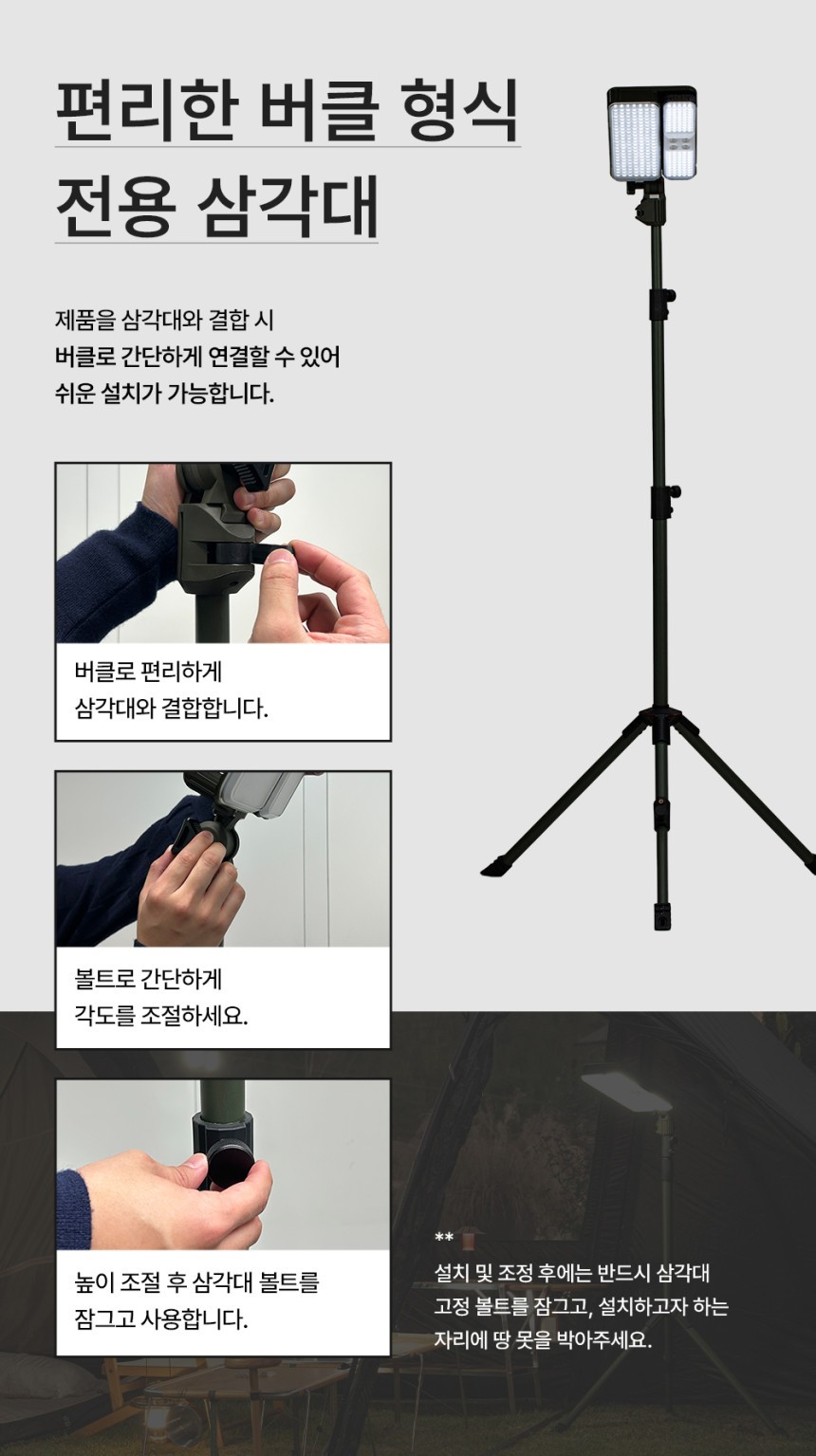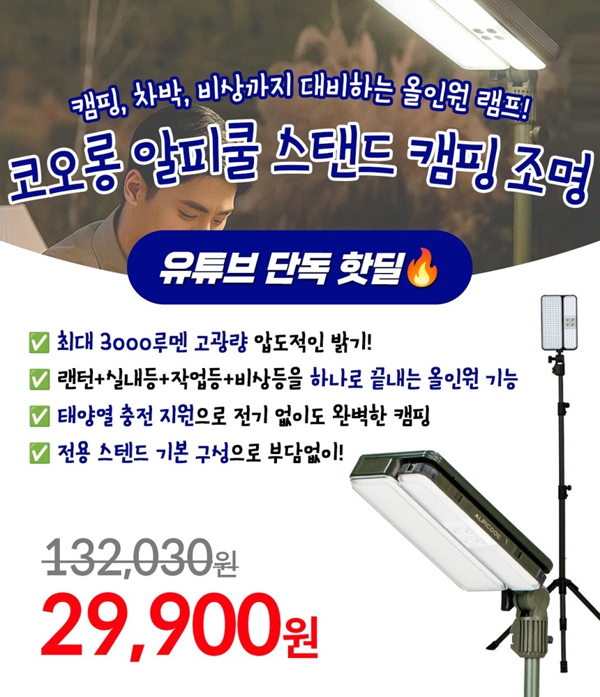 랜턴(램프) / 실내등 / 최대밝기 : 3000루멘 / 밝기조절 : 5단계 / 최대사용시간 : 11.5시간 / 전원공급방식 : USB충전식 , 태양열 / 부가기능 : 점멸등 , 생활방수 , 자석내장 , 보조배터리 / 무게 : 930g / 크기(가로x세로x높이): 메인램프-12.2x32.4x5.9cm, 사이드램프-8x30.4x3.9cm