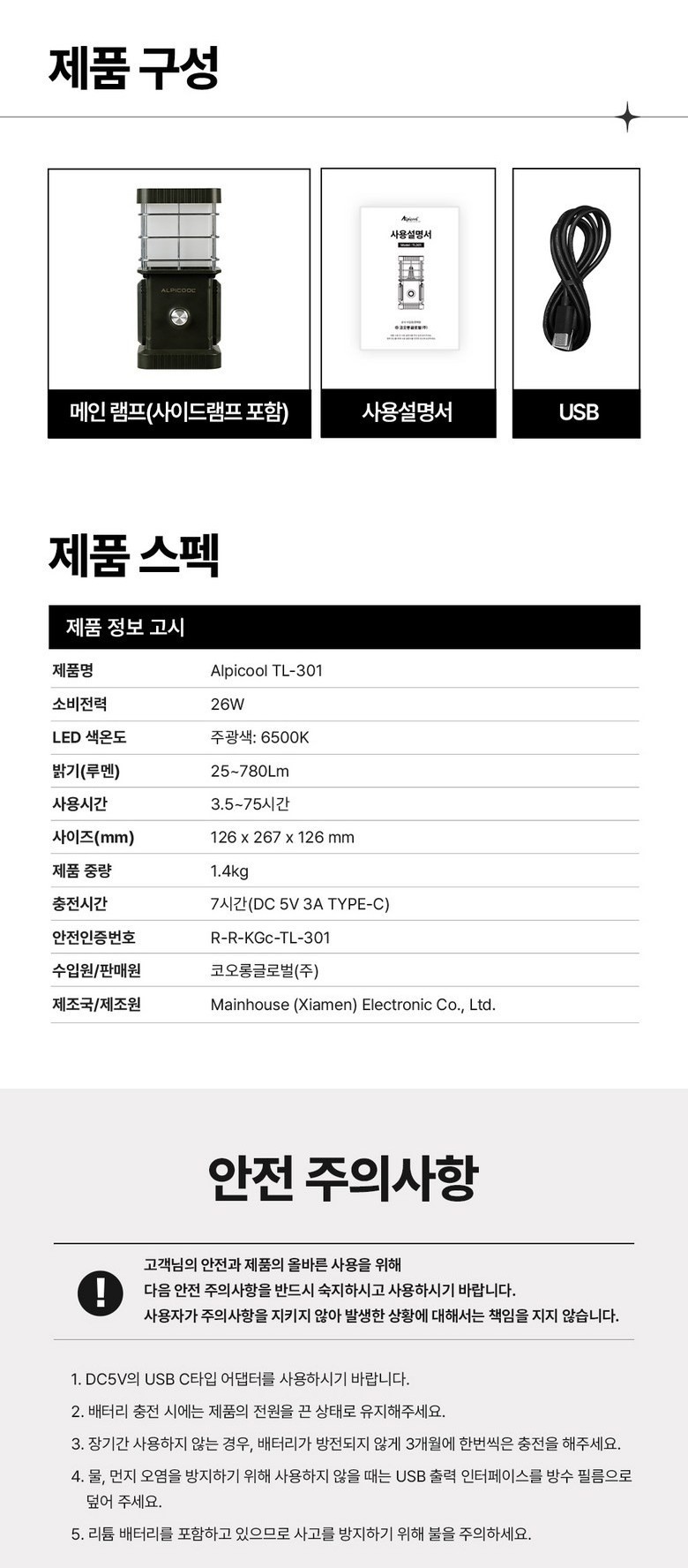 랜턴(램프) / 실내등 / 최대밝기 : 780루멘 / 밝기조절 : 3단계 / 최대사용시간 : 75시간 / 전원공급방식 : USB충전식 / 부가기능 : 점멸등 , 생활방수 , 보조배터리 / 무게 : 1400g / 크기(가로x세로x높이): 12.6x26.7x12.6cm