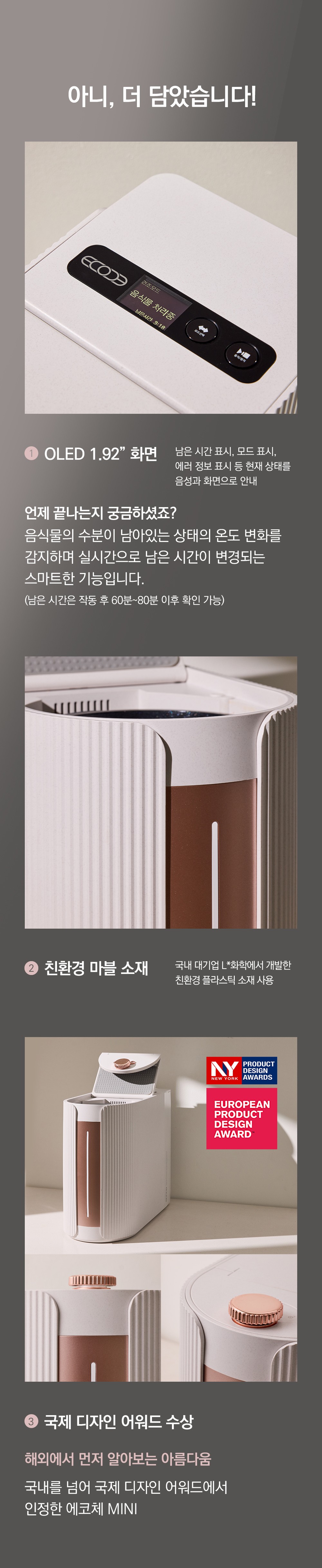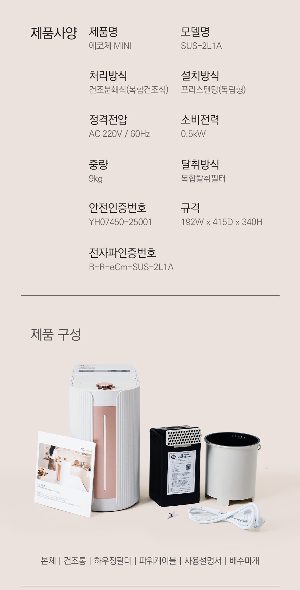 용도 : 가정용 / 처리용량 : 2kg / 처리방식 : 건조+분쇄 / 탈취 : 활성탄필터 / 감소량 : 90%