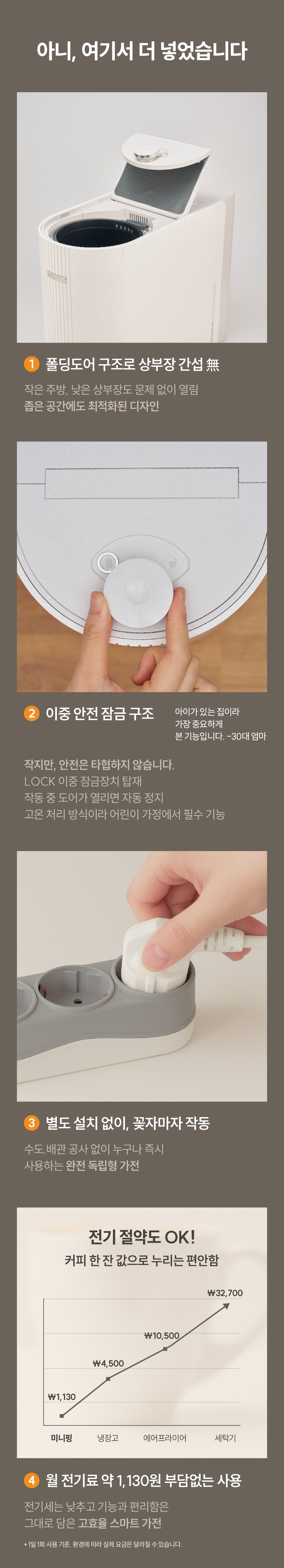 밖에 매번 음식물 쓰레기 봉투 버리러 가는 귀찮음은 이제 그만!! 강력한 건조 살균기능으로 음식물쓰레기를 위생적으로 처리할수있고 초저소음으로 밤에도 사용가능해요! 20만원대의 초특가로 뉴퍼마켓에서 만나보세요